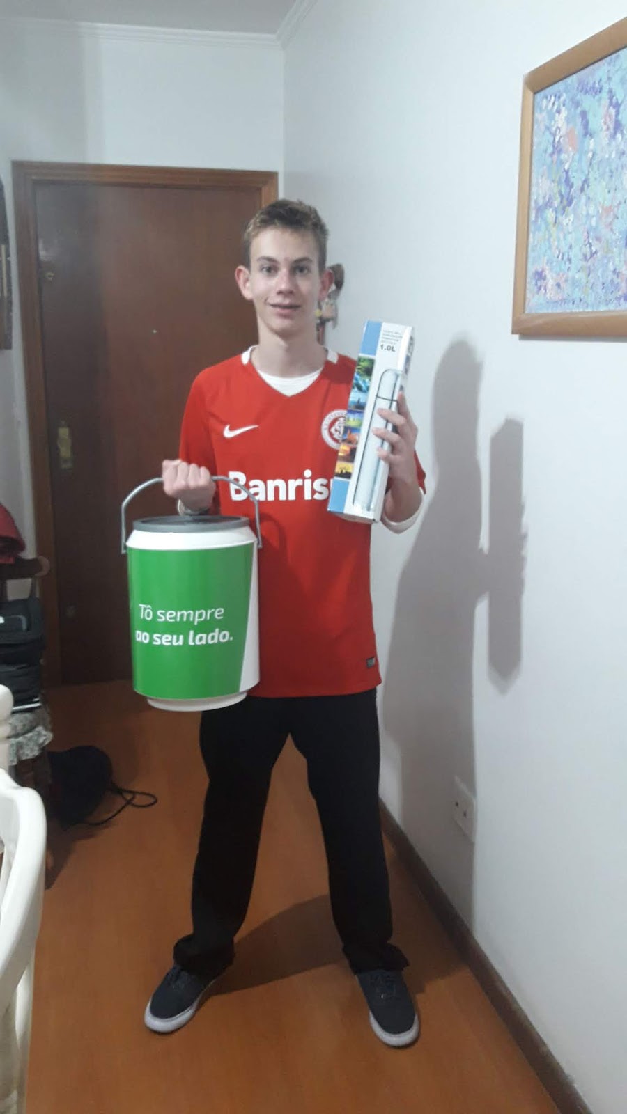 Feliz na chegada, com brindes que ganhou...